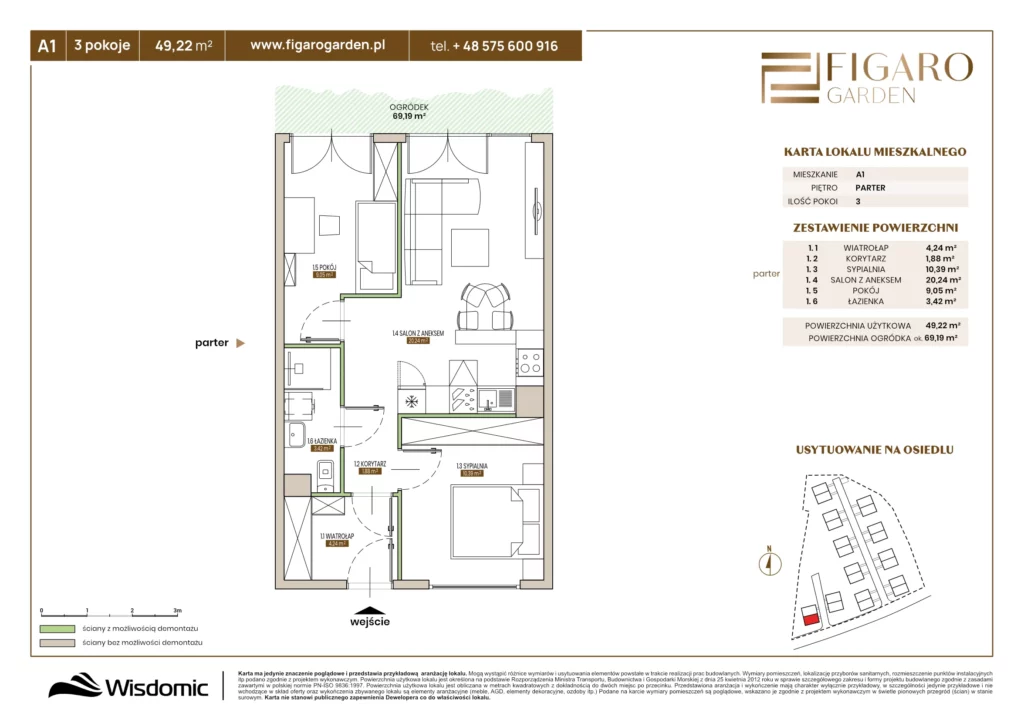 Wszelkie wizualizacje, animacje, modele budynków i tym podobne materiały przedstawione na stronie internetowej https://figarogarden.pl, mają charakter wyłącznie prezentacyjny i mogą one odbiegać od rzeczywistego wyglądu budynków i ich otoczenia, w szczególności w zakresie kolorystyki oraz konstrukcji. Zagospodarowanie terenu, niezwiązane bezpośrednio z inwestycją, jest jedynie przykładem i nie będzie realizowane w ramach inwestycji. Strona nie ma charakteru publicznego zapewnienia w rozumieniu art. 556[1] kodeksu cywilnego ani oferty w rozumieniu 66 § 1 kodeksu cywilnego. Szczegółowe i wiążące informacje dotyczące inwestycji zawarte są w prospekcie informacyjnym, umowie deweloperskiej oraz projekcie budowlanym.